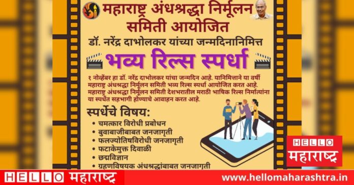 हॅलो महाराष्ट्र ऑनलाईन। दिनांक १ नोव्हेंबर रोजी डॉ. नरेंद्र दाभोळकर यांचा जन्मदिवस आहे. या निमित्ताने यंदा महाराष्ट्र अंधश्रद्धा निर्मूलन समितीतर्फे मराठी भाषिक कलाकारांसाठी भव्य रिल्स स्पर्धेचे आयोजित करण्यात आले आहे. याकरिता महाराष्ट्र अंधश्रद्धा निर्मूलन समितीने संपूर्ण देशभरातील मराठी भाषिक रिल्स निर्मात्यांना या स्पर्धेत सहभागी होण्याचे आवाहन केले आहे. सोबतच या स्पर्धेसाठी काही नियम आणि अटींची पूर्तता करणे आवश्यक आहे. तर या नियम आणि अटी खालीलप्रमाणे :-