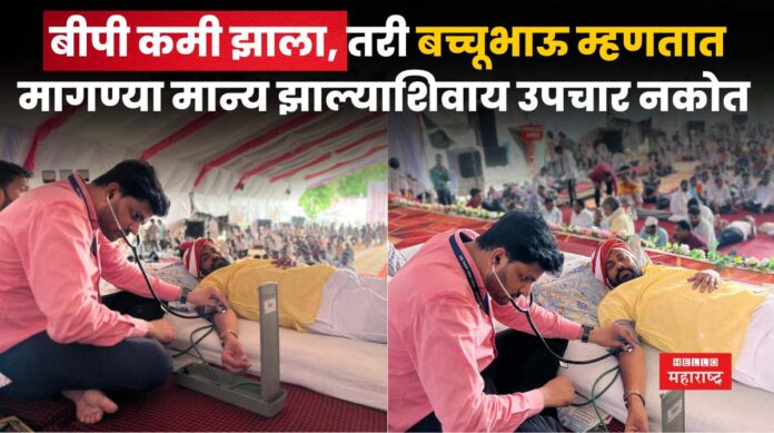 हॅलो महाराष्ट्र ऑनलाईन । शेतकऱ्यांच्या प्रश्नांवर तसेच सातबारा कोरा करण्यासह इतर काही मागणीसाठी प्रहार जनशक्ती पक्षाचे अध्यक्ष बच्चू कडू (Bachhu Kadu) यांनी मोझरी येथील राष्ट्रसंत तुकडोजी महाराज यांच्या समाधीस्थळी बेमुदत अन्नत्याग आंदोलन केलं आहे. या आंदोलनाचा आज तिसरा दिवस आहे. संपूर्ण महाराष्ट्रातून बच्चू कडू यांच्या आंदोलनाला मोठा पाठिंबा मिळत असताना आज अचानक बच्चू कडू यांचा बीपी कमी झाला. डॉक्टरांची टीम तातडीने उपोषणस्थळी दाखल झाली, मात्र बच्चू कडू यांनी कोणताही उपचार घेण्यास स्पष्टपणे नकार दिला आहे. जोपर्यन्त मागण्या मान्य होणार नाहीत तोपर्यंत मी कोणतेही उपचार घेणार नाही अशी भूमिका बच्चू कडू यांनी घेतली आहे.