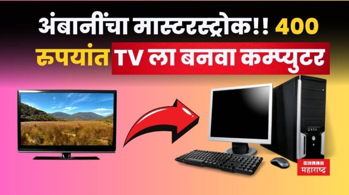 हॅलो महाराष्ट्र ऑनलाईन । तुम्हाला जर कोणी म्हटलं कि तुमच्या घरातील TV कम्प्युटर मध्ये कन्व्हर्ट होऊ शकतो तर तुम्ही वेड्यात काढाल…. हे कस शक्य आहे असं म्हणाल.. परंतु तंत्रज्ञानाच्या या युगात हे पण शक्य झालं आहे. मुकेश अंबानी यांच्या Jio ने ही किमया करून दाखवली आहे. रिलायन्स जिओने पूर्णपणे नवीन Jio PC लाँच केला आहे. JioPC ही एक नवीन व्हर्च्युअल डेस्कटॉप सेवा आहे जी आपल्या जिओ सेट टॉप बॉक्स डिव्हाइसद्वारे चालते. ज्याचा खर्च अवघा ४०० रुपये आहे. त्यामुळे तुम्हीही जर नवीन कम्प्युटर खरेदी करणार तर थांबा …. त्याआधी जिओ ची हि सुविधा जाणून घ्या…