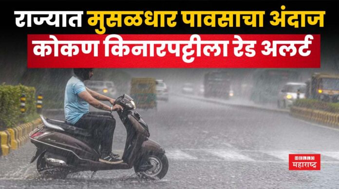 हॅलो महाराष्ट ऑनलाईन Maharashtra Rain Updates । महाराष्ट्रात आज मुसळधार पावसाचा अंदाज वर्तवण्यात आला आहे. मुंबई, रायगड आणि रत्नागिरी जिल्ह्यासाठी आज रेड अलर्ट जारी करण्यात आला असून सिंधुदुर्ग, कोल्हापूर, सातारा आणि पुणे जिल्ह्यासाठी ऑरेंज अलर्ट देण्यात आला आहे. उर्वरित राज्यात अनेक ठिकाणी मध्यम ते जोरदार पावसाच्या सरी कोसळणार आहेत.