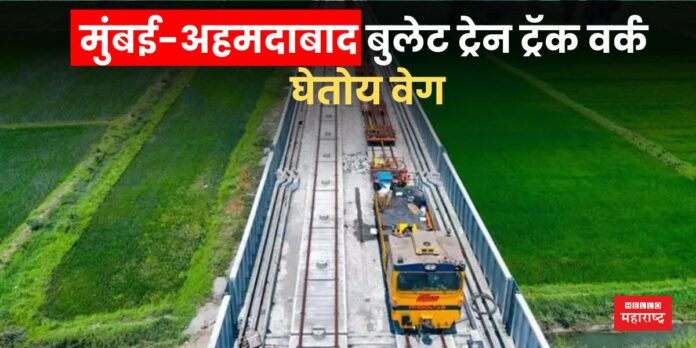 Mumbai-Ahmedabad Bullet Train: मुंबई-अहमदाबाद बुलेट ट्रेन प्रकल्पाने आता प्रत्यक्ष ट्रॅक वर्कमध्ये दमदार प्रगती केली आहे. नॅशनल हाय स्पीड रेल कॉर्पोरेशन लिमिटेड (NHSRCL) ने दिलेल्या ताज्या अपडेटनुसार गुजरातमध्ये बुलेट ट्रेनच्या ट्रॅकवरचे काम अगदी रॉकेटसारख्या वेगाने सुरू आहे. गुजरातमधील विविध भागांमध्ये वायडक्टवर ट्रॅक स्लॅब बसवणे आणि सीमेंट डामर मोर्टार (CAM) भरण्याचे काम वेगाने सुरू आहे.