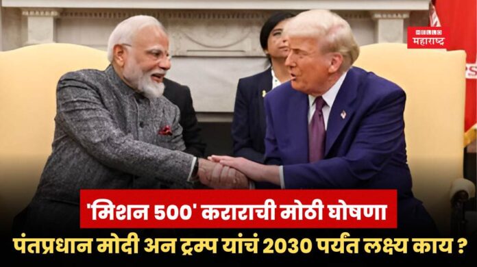 हॅलो महाराष्ट्र ऑनलाईन । पंतप्रधान नरेंद्र मोदी अमेरिका दौऱ्यादरम्यान डोनाल्ड ट्रम्प यांना भेटले. दौऱ्यादरम्यान भारत आणि अमेरिका यांच्यात द्विपक्षीय संबंध बळकट करण्यासाठी आणि रोजगार निर्मितीसाठी अनेक महत्त्वाचे करार करण्यात आले. यामध्ये सर्वाधिक चर्चेत असणारी योजना ‘मिशन 500’ आहे . या कराराद्वारे भारत आणि अमेरिकेचे उद्दिष्ट 2030 पर्यंत द्विपक्षीय व्यापार 500 अब्ज डॉलर्सपर्यंत पोहोचविण्याचे ठरवले आहे. म्हणजेच पुढील काही काळात भारताला याचा मोठा फायदा होणार आहे.