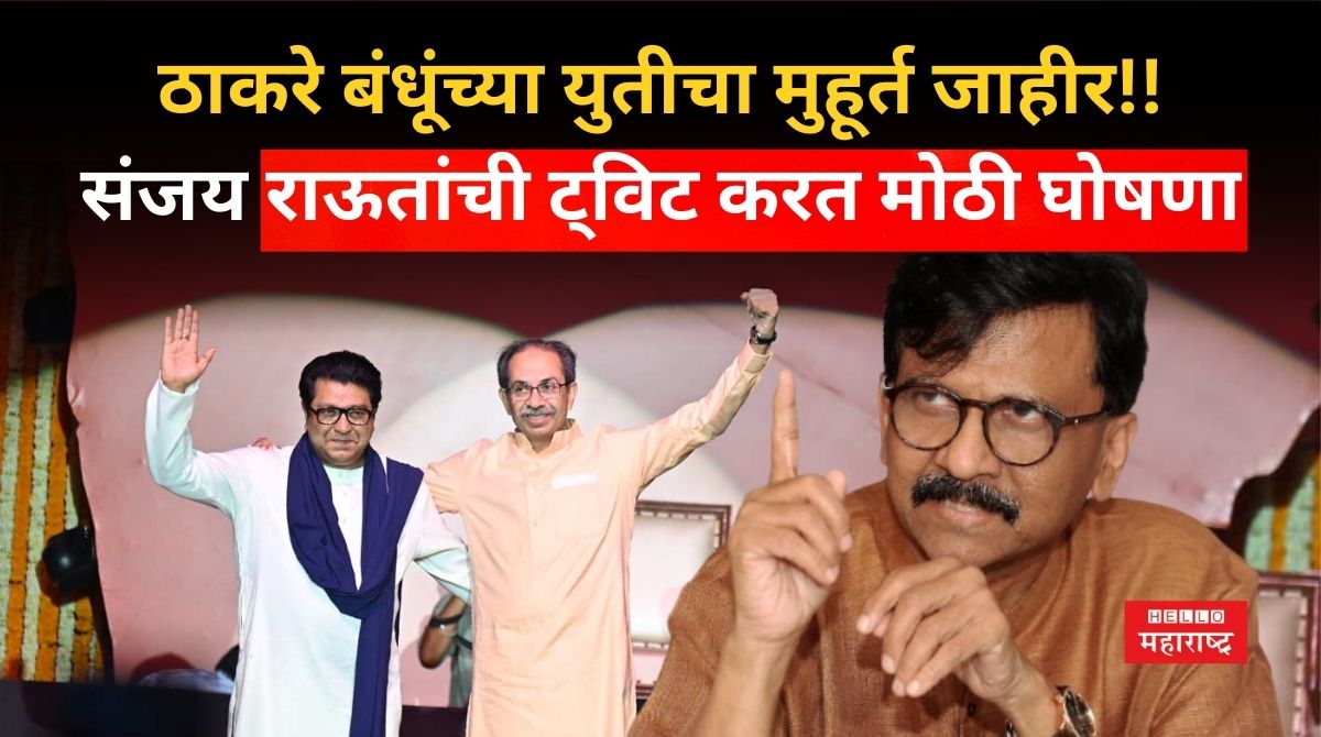 हॅलो महाराष्ट्र ऑनलाईन Raj Uddhav Alliance । मुंबईत महापालिका निवडणुकीच्या पार्श्वभूमीवर शिवसेना ठाकरे गट आणि मनसेच्या युतीची घोषणा नेमकी कधी होणार याबाबत मुंबईकरांच्या मनात मोठी उत्सुकता लागून राहिलेली आहे. दोन्ही पक्षाकडून मागील काही दिवसापासून जागावाटपावर चर्चा सुरु आहेत. मात्र अधिकृतरीत्या राज आणि उद्धव ठाकरेंची युती कधी होणार हे स्पष्ट होत नव्हते. मात्र आता शिवसेना ठाकरे गटाचे खासदार संजय राऊत यांनी एक ट्विट करत संपूर्ण महाराष्ट्राला ब्रेकिंग न्यूज दिली आहे. ठाकरे बंधूंच्या युतीचा मुहूर्त संजय राऊतांनी जाहीर केला आहे. \
